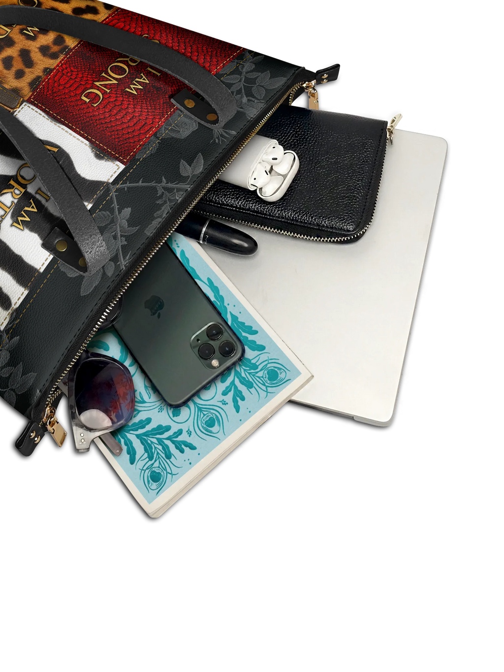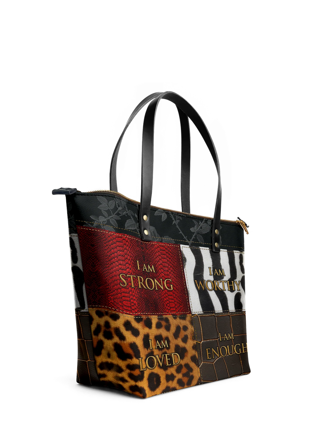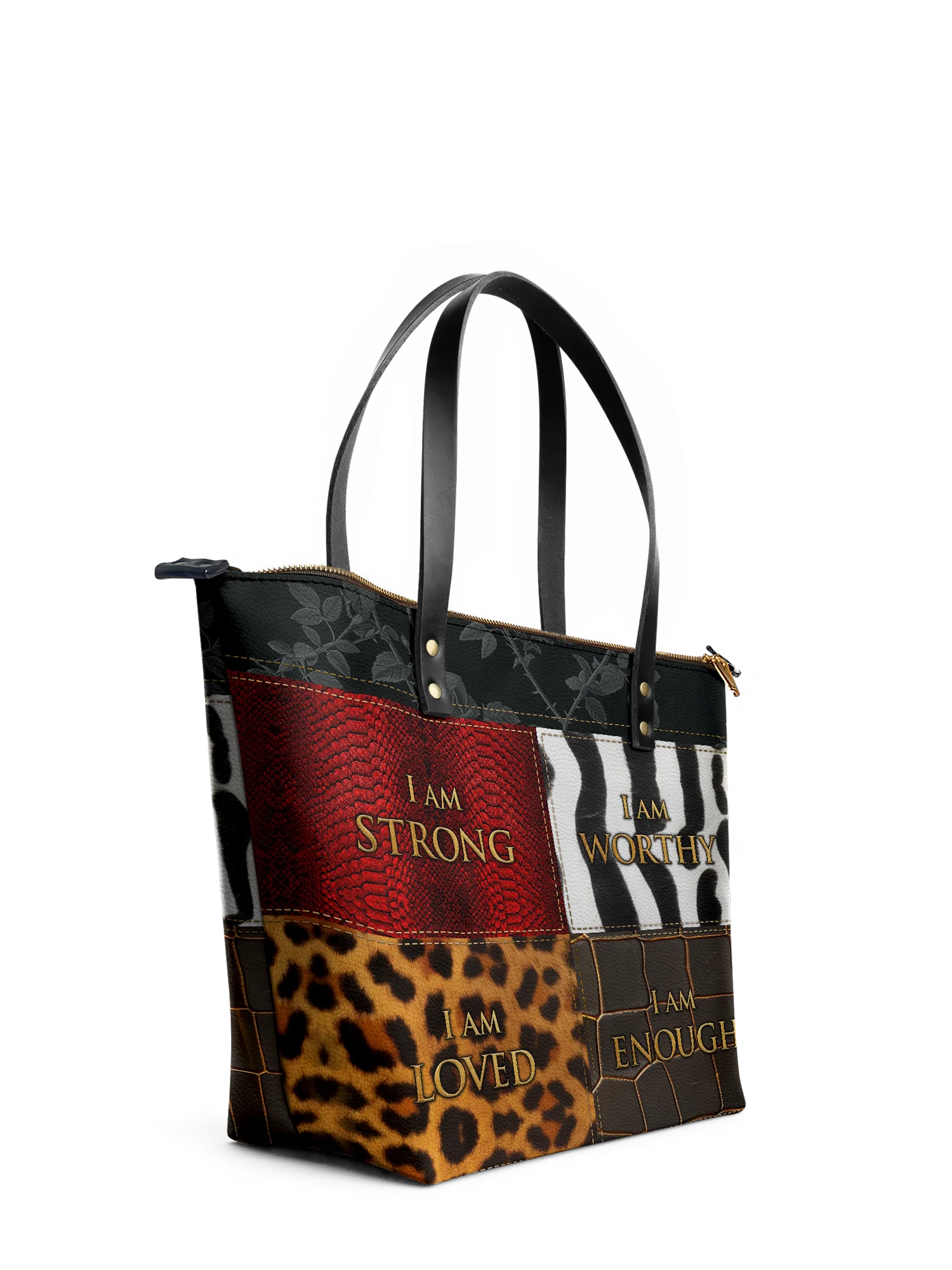 The "Kadia" Tote, meaning "strong leader," is a bold statement of self-worth. Featuring "I am strong, worthy, loved, enough", it celebrates the power of Black women. Inspired by Africa’s iconic animals—snake, zebra, leopard, and crocodile—this tote symbolizes resilience, confidence, and beauty. Carry it as a daily affirmation of your strength!