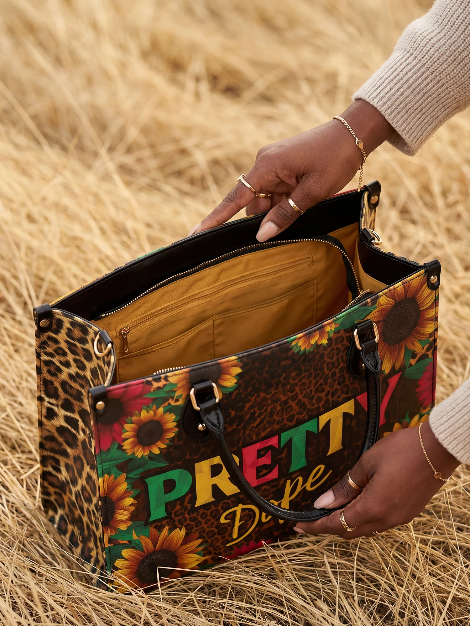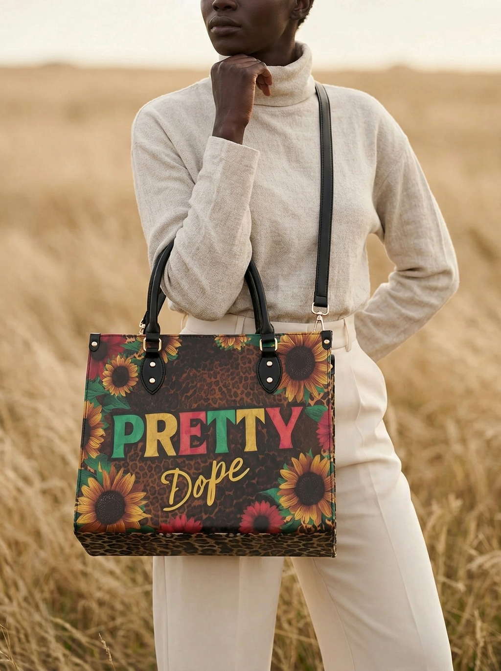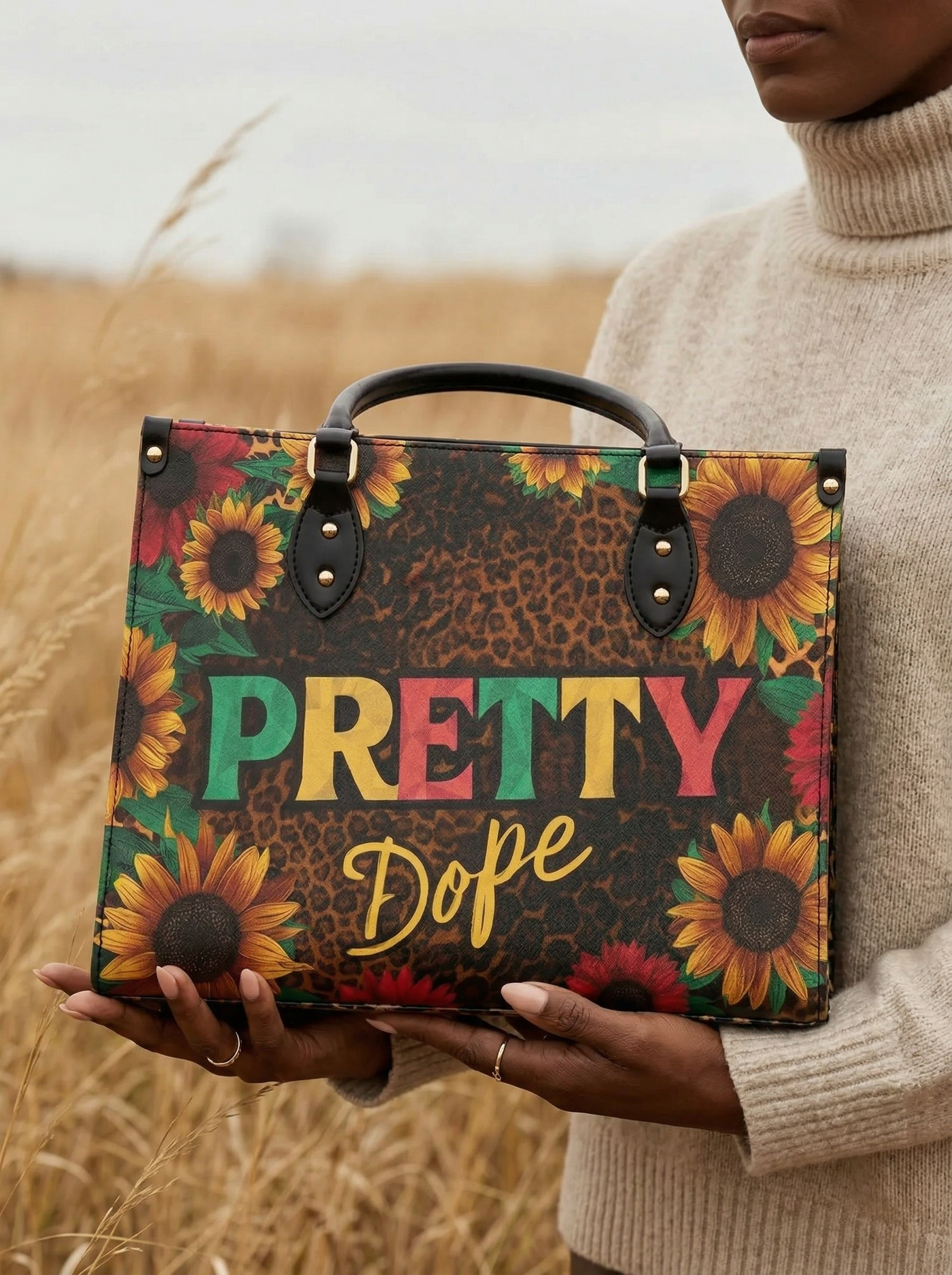 The Solya Leather Handbag is your daily reminder that being soft and radiant doesn’t mean you’re not powerful too. Surrounded by blooming sunflowers, rooted in bold leopard print, and crowned with the unapologetic truth—Pretty Dope—this bag is a full vibe.