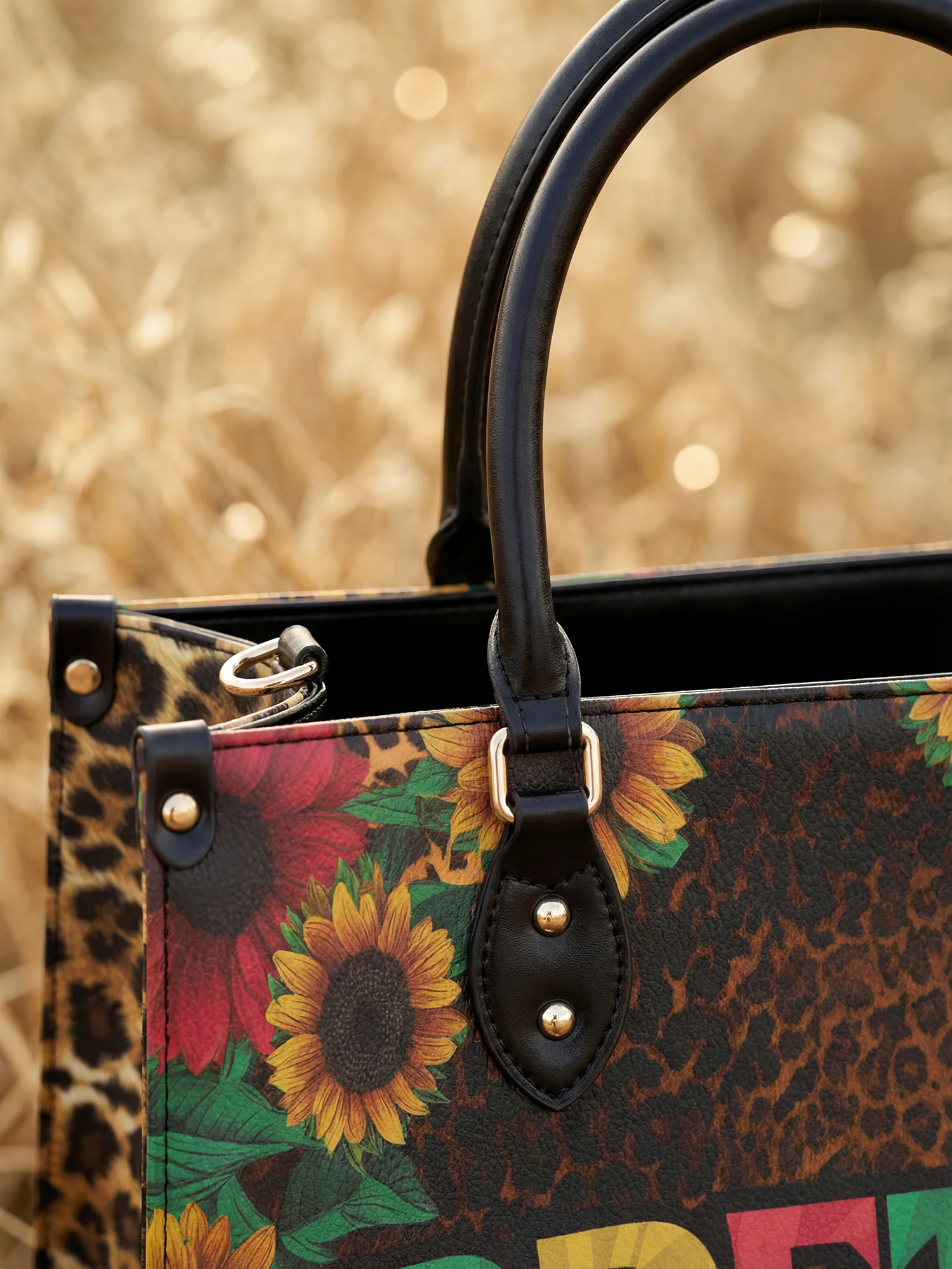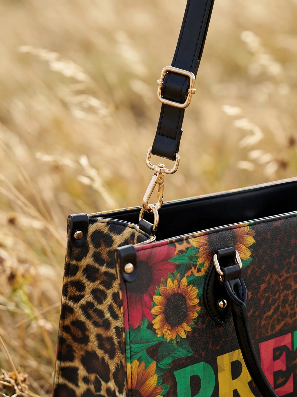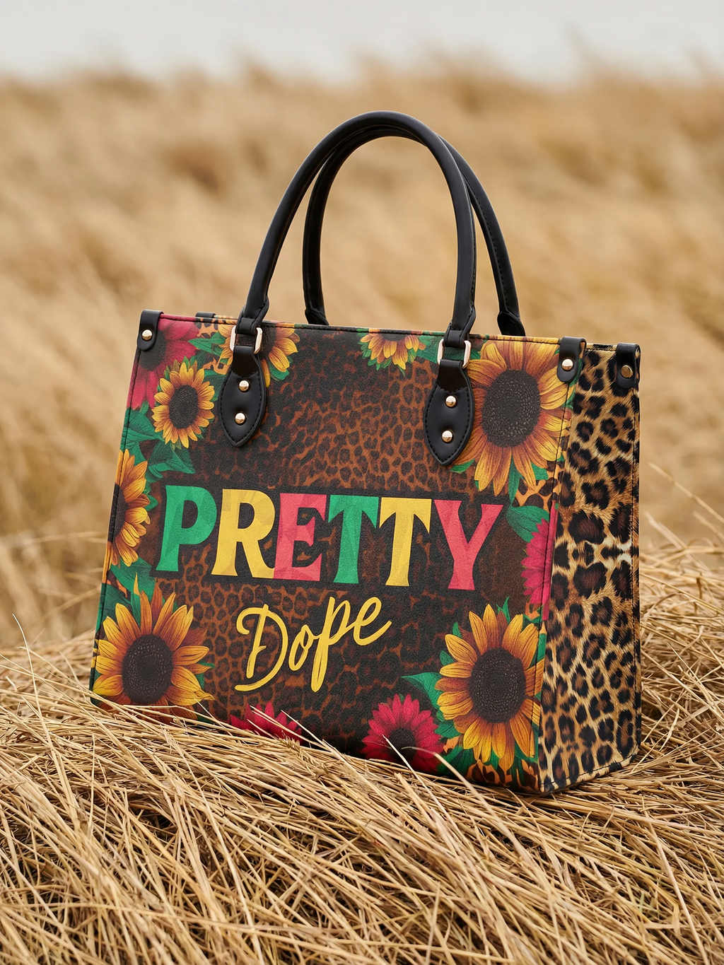 The Solya Leather Handbag is your daily reminder that being soft and radiant doesn’t mean you’re not powerful too. Surrounded by blooming sunflowers, rooted in bold leopard print, and crowned with the unapologetic truth—Pretty Dope—this bag is a full vibe.