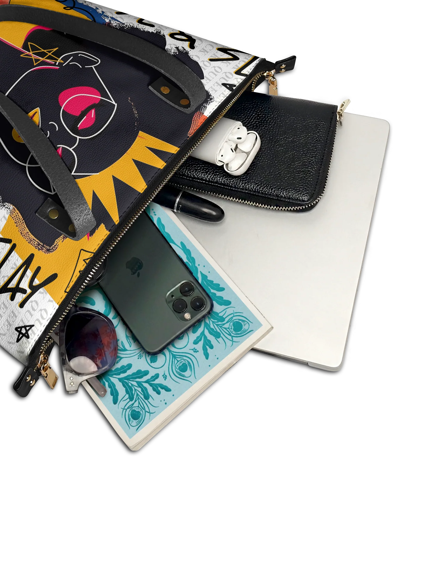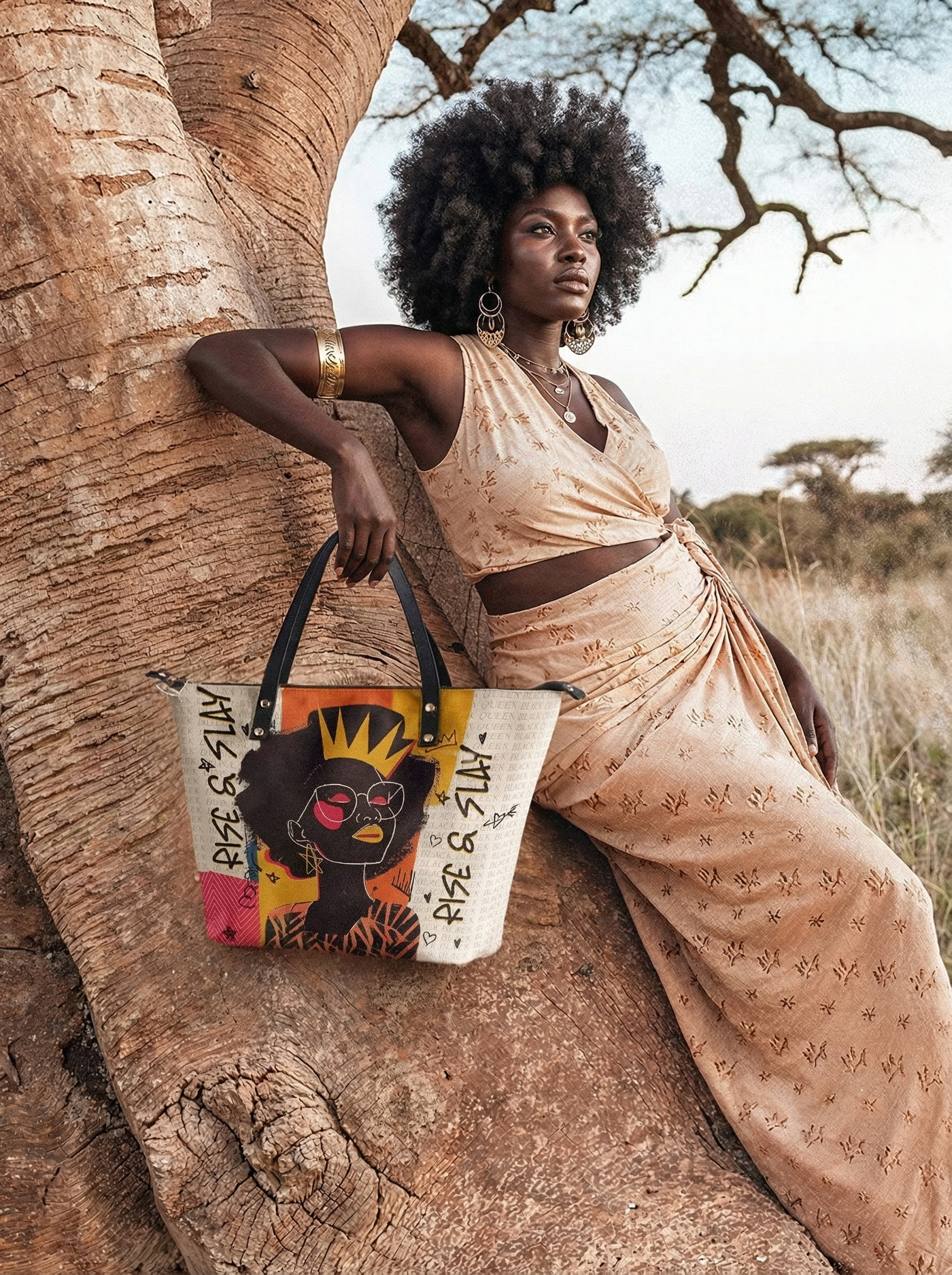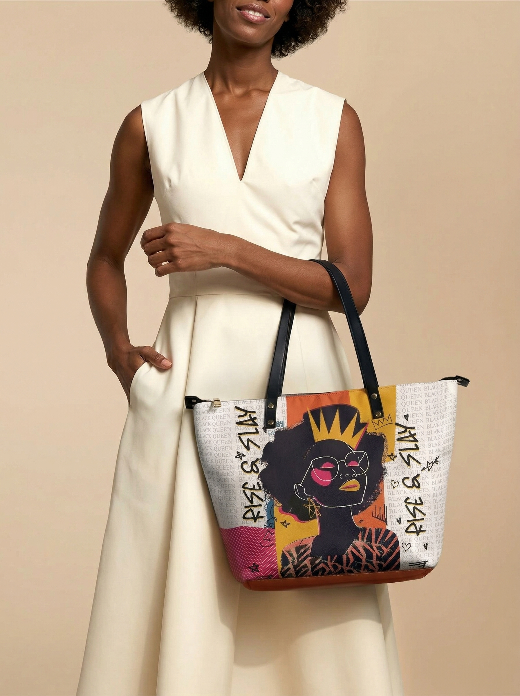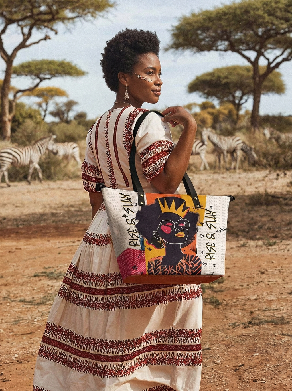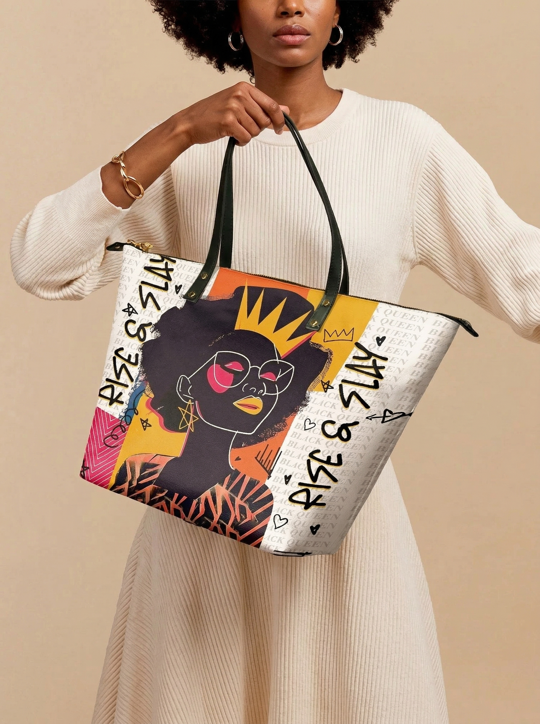 "Aina" is not just a tote—it’s a bold celebration of Black women’s strength, beauty, and resilience. Featuring vibrant Afrocentric art and the empowering Rise & Slay message, this bag is made for queens who own their power. Spacious, stylish, and durable, "Aina" carries your essentials while reminding you to shine unapologetically every day.