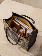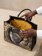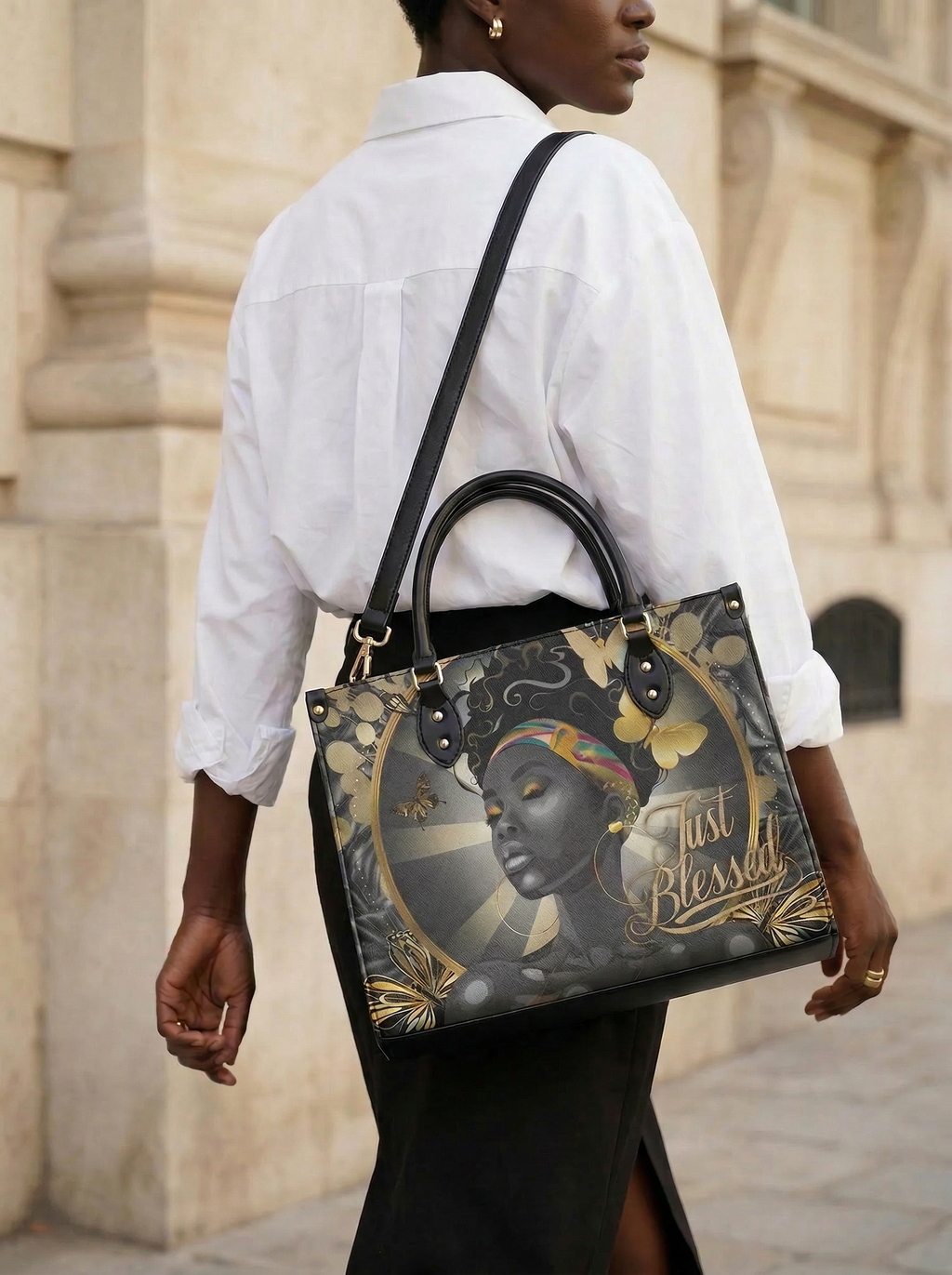 Featuring the elegant "Just Blessed!" quote, this design reflects the unshakable confidence and gratitude of a woman who recognizes her power, beauty, and spiritual abundance. The rich black and gold tones, paired with intricate artistic details, make this handbag a bold and meaningful statement piece. Carry your blessings with style and purpose!
